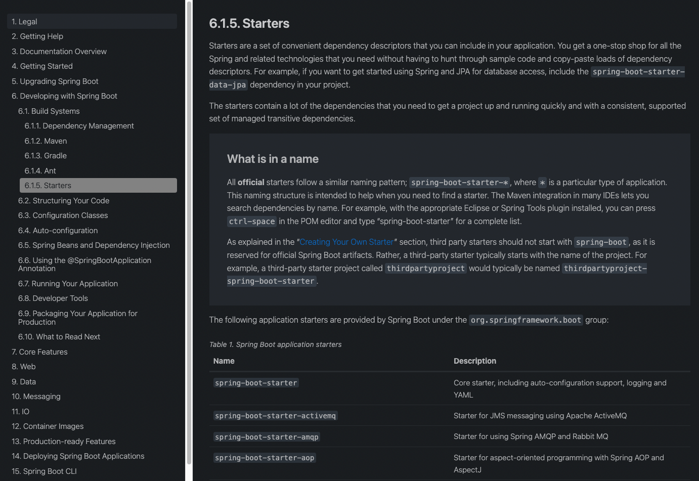 Reference 문서에서는 다음과 같이 스프링 부트에서 제공하는 각각의 애플리케이션 스타터 목록을 확인할 수 있습니다.