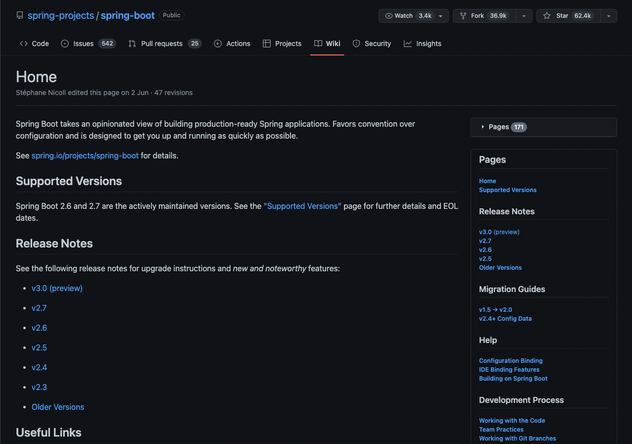 스프링 부트의 버전별 차이점을 확인하기 위해서는 스프링 부트 깃허브에서 위키를 확인해줍니다.