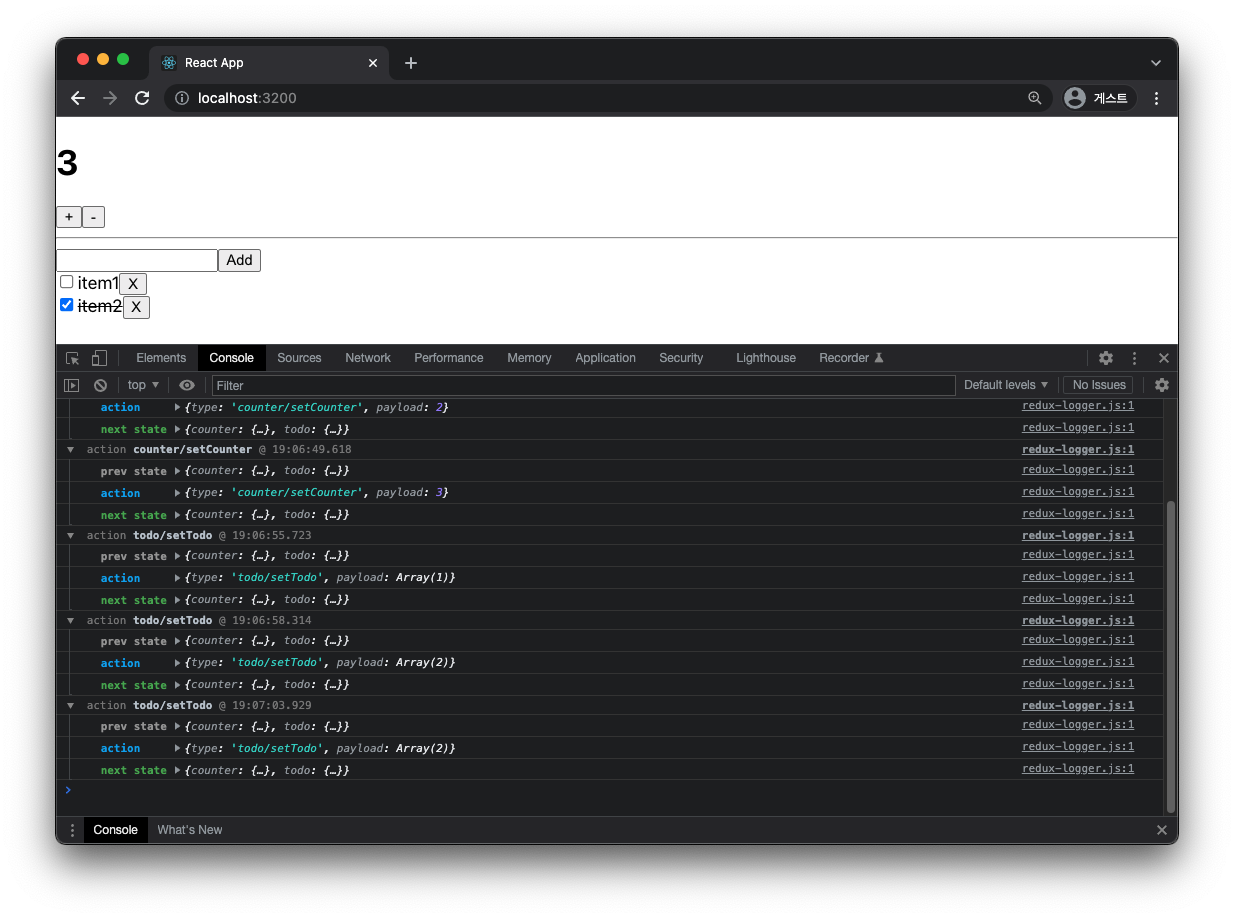 redux-logger와 같은 리덕스 미들웨어를 설정.