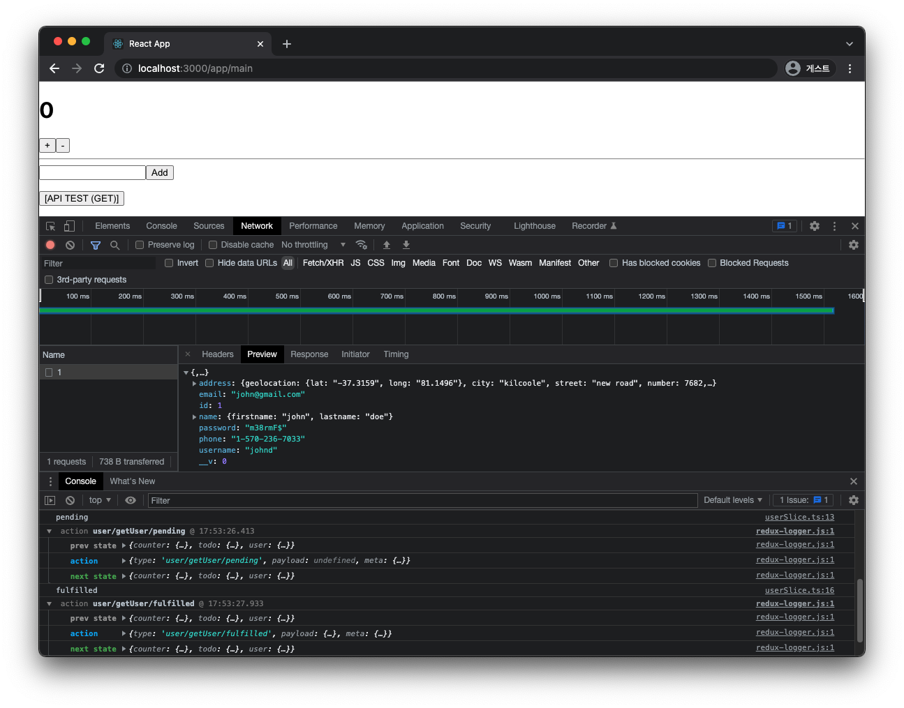 여기까지 구성하고 애플리케이션을 실행해보면 다음과 같이 Redux Toolkit이 적용되어 상태 관리가 이루어지는 것을 확인할 수 있습니다.